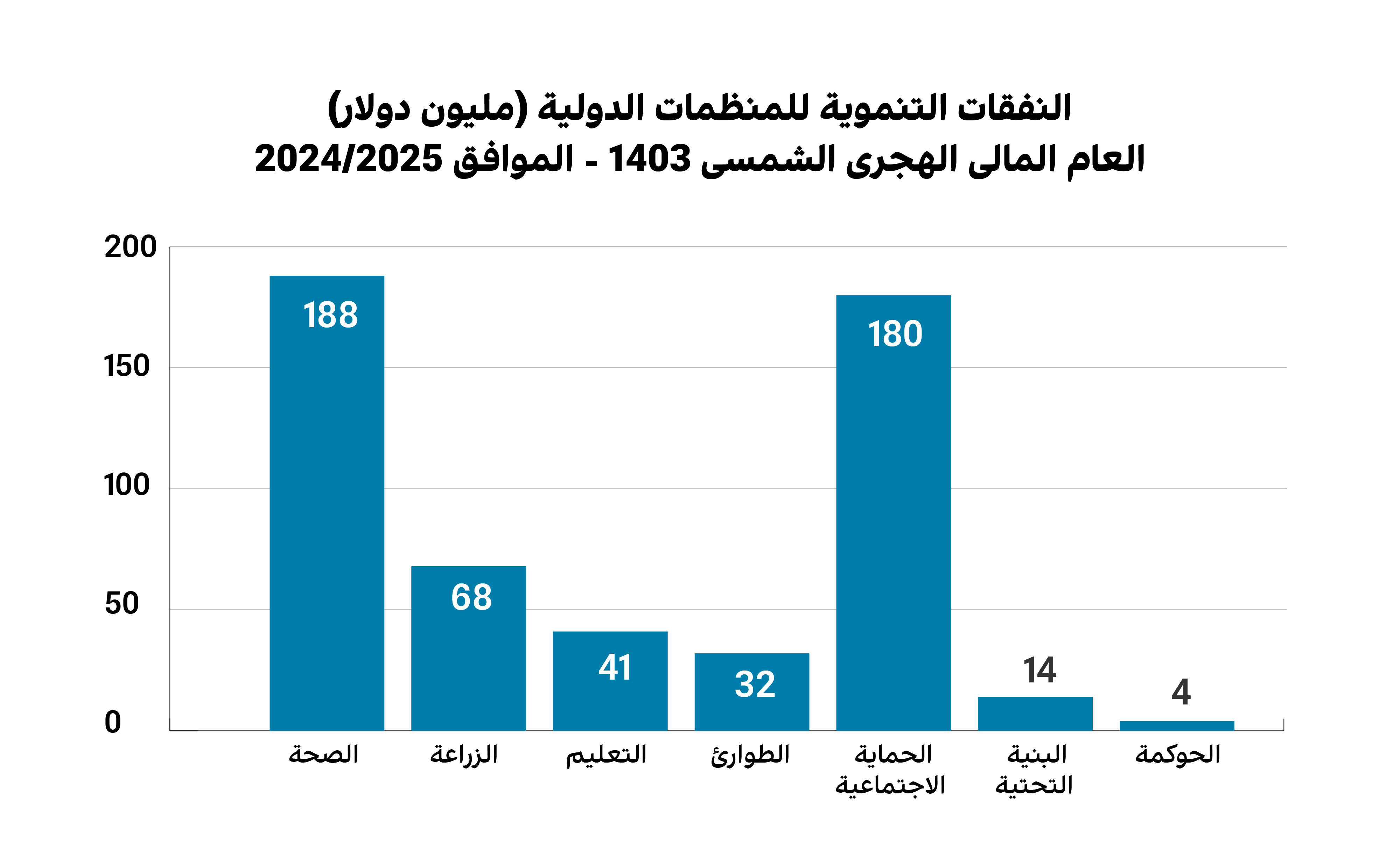 كما يُظهر الرسم البياني، نجحت المنظمات الدولية إلى حد كبير في سد الفراغ الناتج عن تراجع طالبان عن القطاعات الأساسية، ولا سيما قطاعي الصحة والحماية الاجتماعية. ورغم التحديات الجدية، بما في ذلك مخاطر إساءة استخدام المساعدات من قبل طالبان، أسهم وجود هذه المنظمات في الحيلولة دون الانهيار الكامل للاقتصاد والمجتمع، وبشكل خاص في منع سقوط النظام الصحي وشبكات الحماية الاجتماعية.