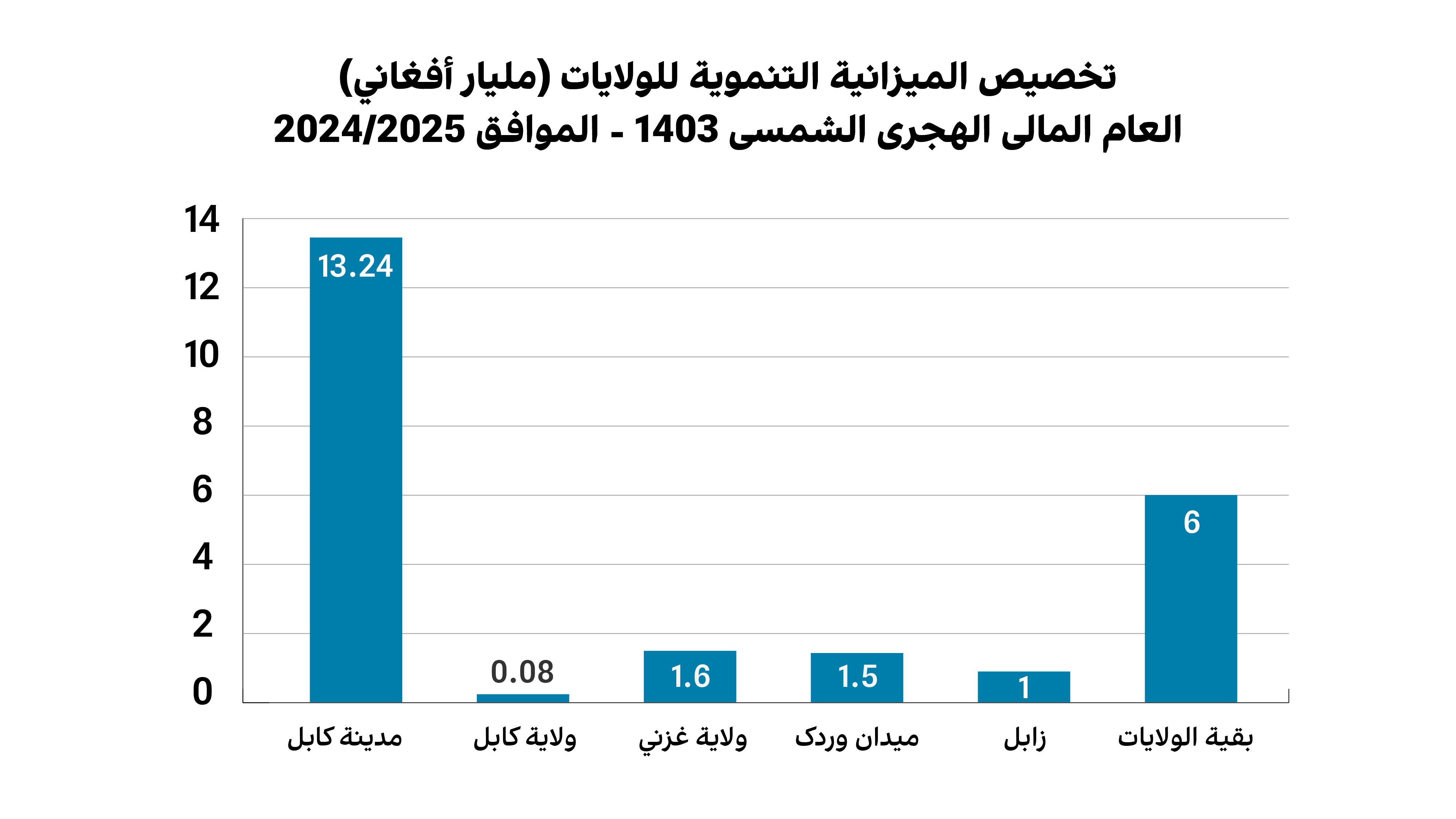 يُعدّ أسلوب توزيع الميزانية الإنمائية على مستوى الولايات أحد أكثر الجوانب إثارة للجدل في هيكل الميزانية لدى طالبان. وتُظهر البيانات الرسمية أن 55٪ من إجمالي الميزانية الإنمائية صُرفت داخل مدينة كابل، وترتفع هذه النسبة إلى 58٪ عند احتساب مخصصات ولاية كابل. فقد أنفقت طالبان في مدينة كابل وحدها 13.24 مليار أفغاني، إضافة إلى 773 مليون أفغاني على مستوى ولاية كابل من ميزانية العام المالي 2024/2025.