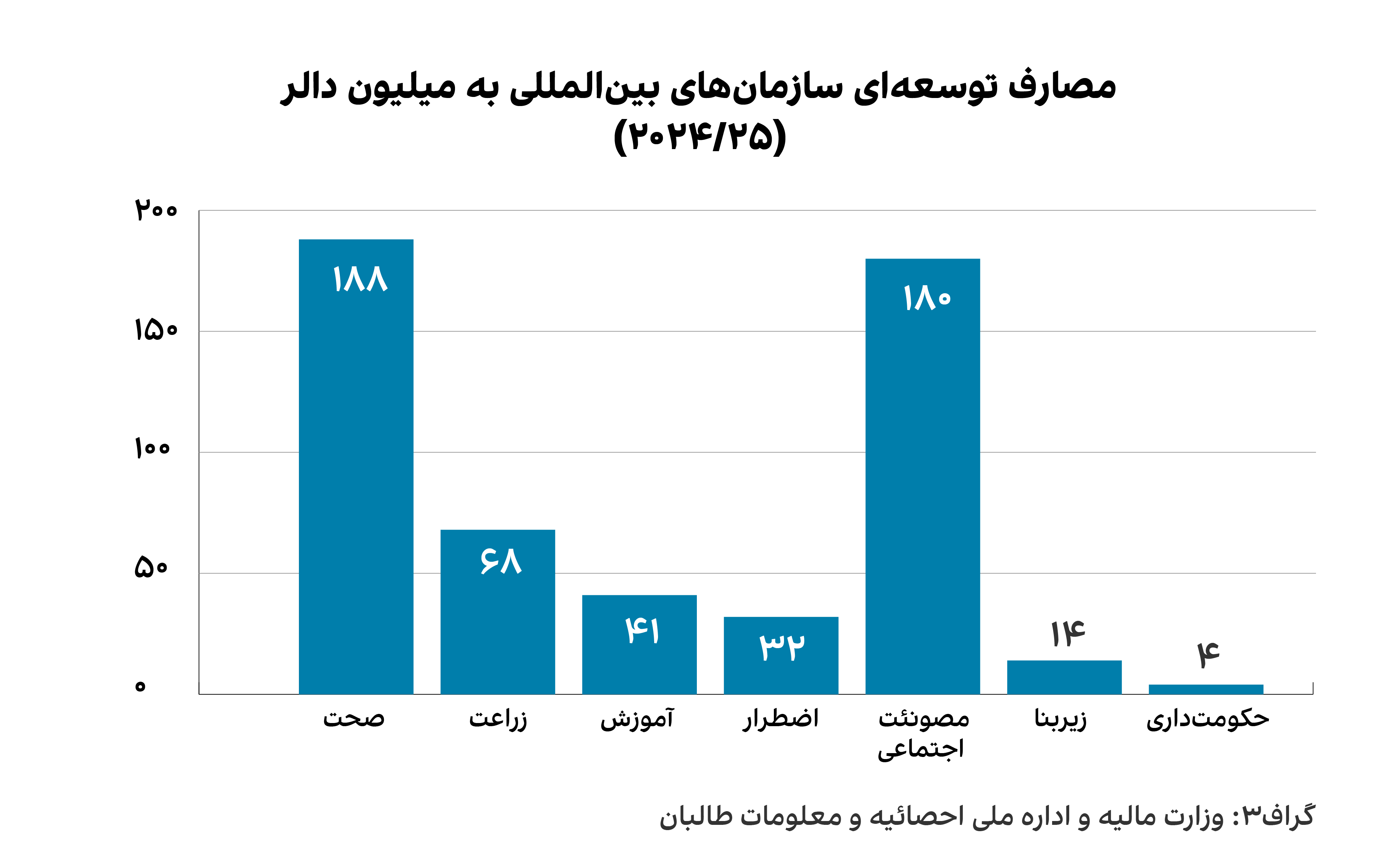 در سال مالی ۱۴۰۳ خورشیدی (۲۰۲۴/۲۵ میلادی)، نهادهای بینالمللی ۵۲۹ میلیون دالر در پروژههای توسعهای هزینه کردهاند؛ رقمی که یک و نیم برابر بیشتر از کل بودجه توسعهای طالبان است.