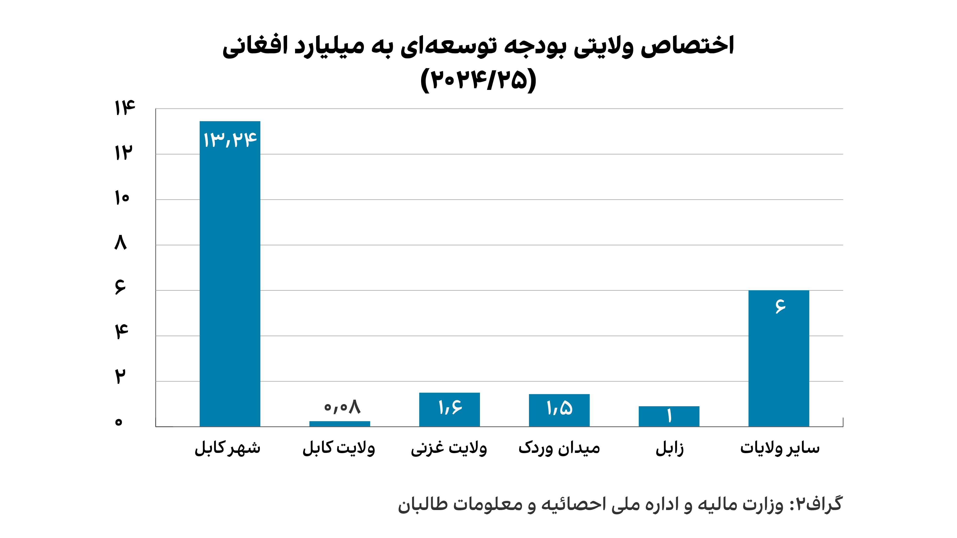 یکی از بحثبرانگیزترین ابعاد ساختار بودجه توسعهای طالبان، نحوه تخصیص آن در سطح ولایات است. بررسی آمارهای رسمی این گروه نشان میدهد که ۵۵ درصد کل بودجه توسعهای در شهر کابل به مصرف رسیده و با احتساب سهم ولایت کابل، این رقم به ۵۸ درصد میرسد. طالبان تنها در شهر کابل ۱۳.۲۴ میلیارد افغانی و در سطح ولایت کابل ۷۷۳ میلیون افغانی از بودجه توسعهای سال ۱۴۰۳ را هزینه کردهاند.